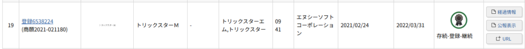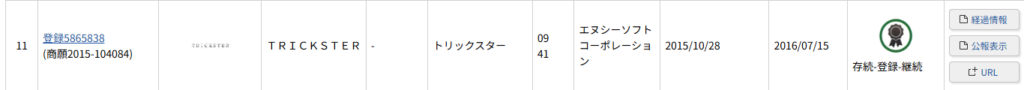 こちらの無印のトリックスターの商標の存続期間の満了日が