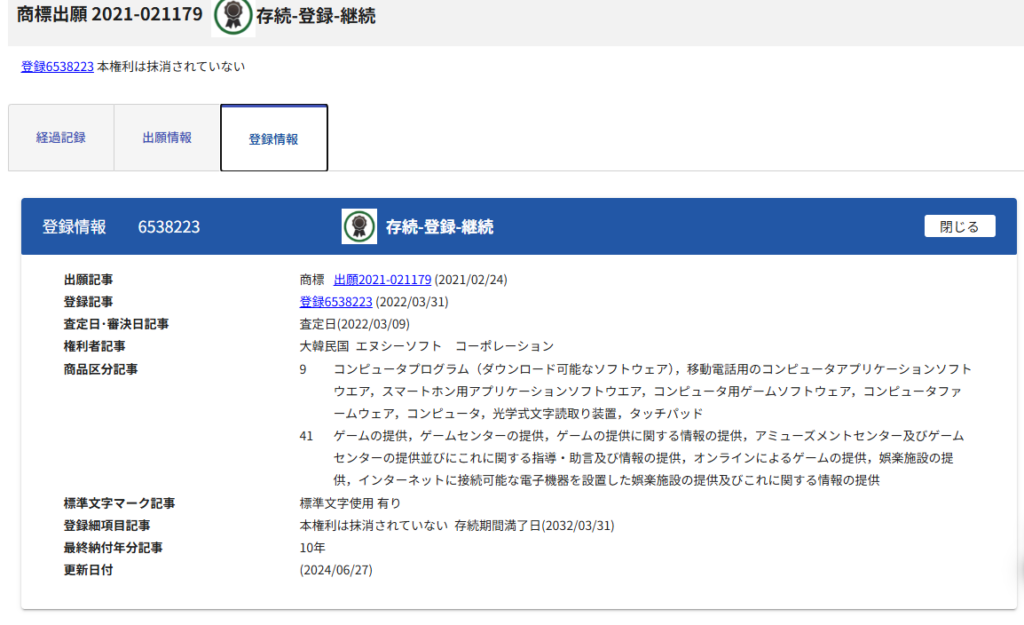 라인 마커로 둘러싸인 부분을 보면 알 수 있는 내용이지만, 이 무인표 트릭스터 상표의 존속 기간 만료일이 올해 7월 15일이라는 점이 은근히 흥미롭습니다. 그리고 NCSOFT는 올해(2026년)에 들어서 트릭스터와 관련된 상표를 갱신하지 않았지만, 막판에 급하게 갱신을 시도할 가능성도 있습니다. (그리고 트릭스터의 권리를 포기할 가능성도 생길 수 있는 이유입니다.)